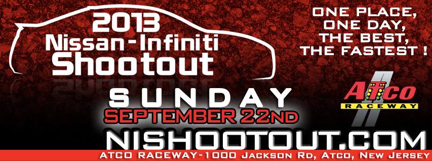 Attachment 1681 WEBSITE: 2013 Nissan Infiniti Shootout "LIKE" us on facebook: https://www.facebook.com/NissanInfinitiShootout From the promotional website: To all Nissan and Infiniti lovers, racers and car show enthusiasts, this is your main event! This is the war to settle the score. This is not just a car show or swap meet… this is where the fastest and quickest Nissans and Infinitis will meet to determine who takes home the trophy and more importantly the bragging rights in their respective class! You will have your chance to prove who is the baddest on the planet! This is where all the smack talkers on the internet, facebook and twitter meet to dual it out like in the wild wild west. You guys have talk the talk now run the run. This is a no holds bar, no rules, “run what you brung and hope you brung enough” heads up race to the finish with the glory going to the last man standing event in each class! The track will be prepped, the air will be cool and the racing will be heated as some of the biggest names will be here to throw down the 1/4 mile! You will see all the notable shops from around the country at one track, at one event. This is the 1st Annual Nissan/Infiniti Shooutout! This event is being held at the world famous, world-class track… the birthplace of import drag racing, Atco Raceway. This event is being held on September 22, 2013 when the good air comes to the east coast to make sure we have the best conditions possible for going as fast and as quick as you can. THIS IS WHERE RECORDS WILL BE SET AND RESPECTED! This will be the place to determine who is the baddest motherwatchyourmouth… in the world! We will have both turbo and non-turbo in all our classes so everyone will get a chance to race. This will be the second event of its kind and we as the Nissan and Infiniti community want to do things BIGGER than last year! We have a few tricks up our sleeve for this years event that we will announce as the date gets closer. |