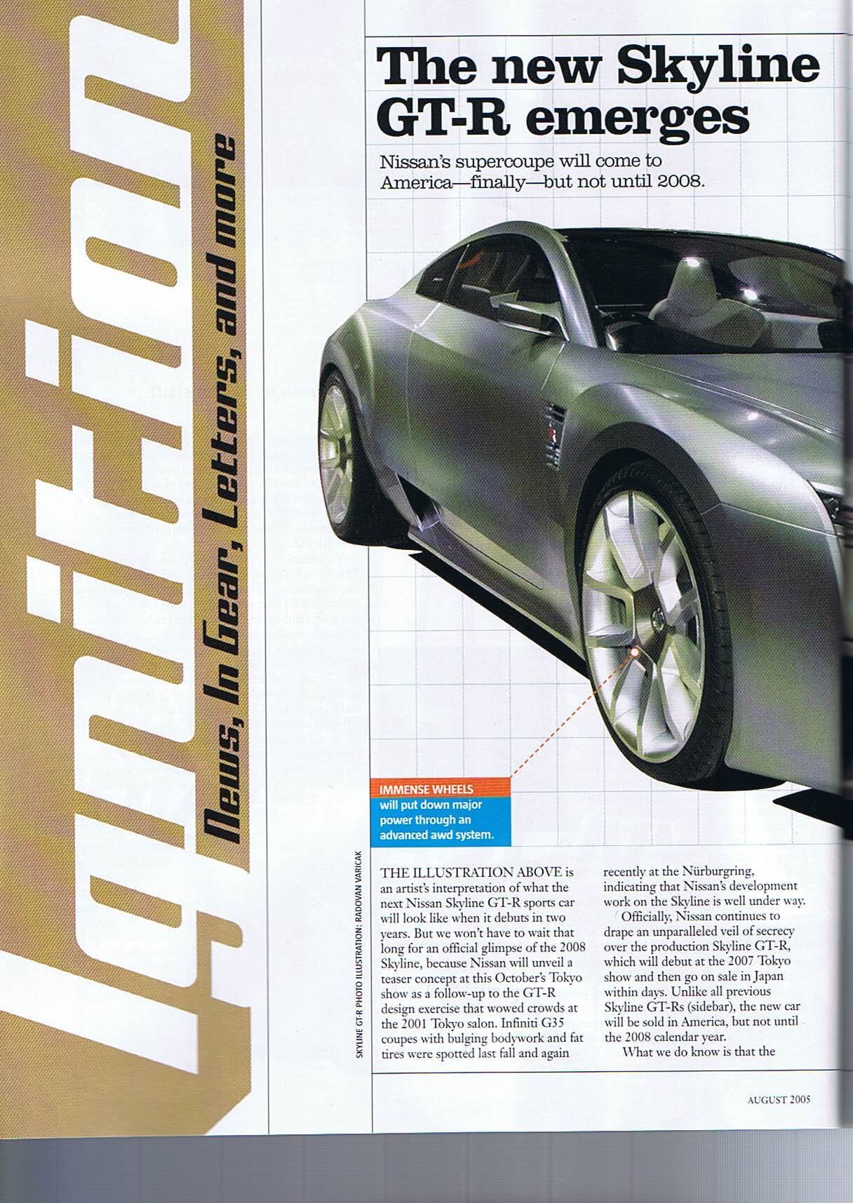 Officially, Nissan continues to drape an unparalleled veil of secrecy over the production Skyline GT-R, which will debut at the 2007 Tokyo show and then go on sale in Japan within days. Unlike all previous Skyline GT-Rs (sidebar), the new car will be sold in America, but not until the 2008 calendar year.