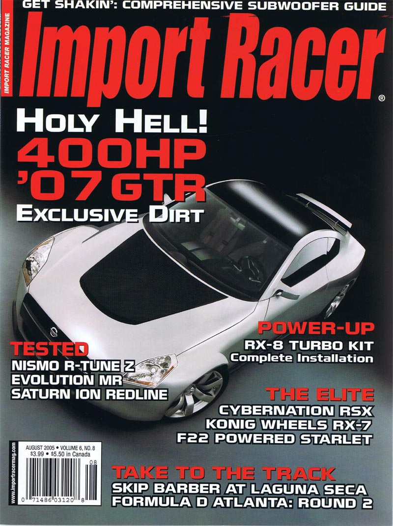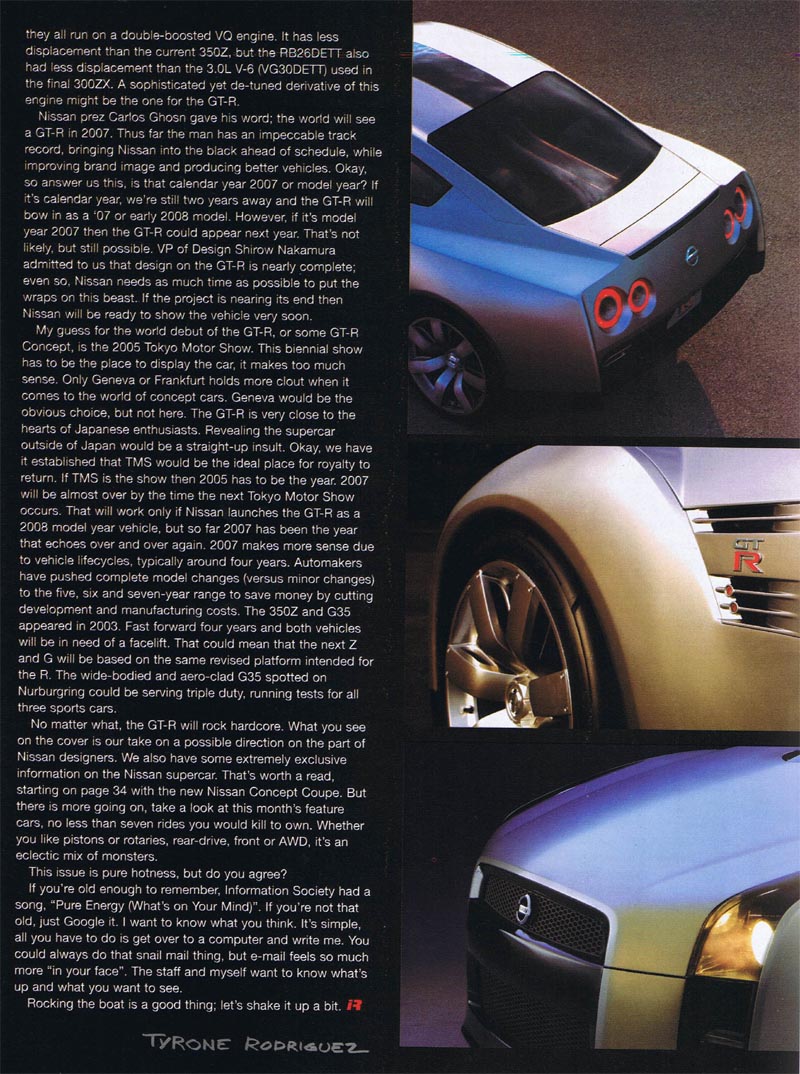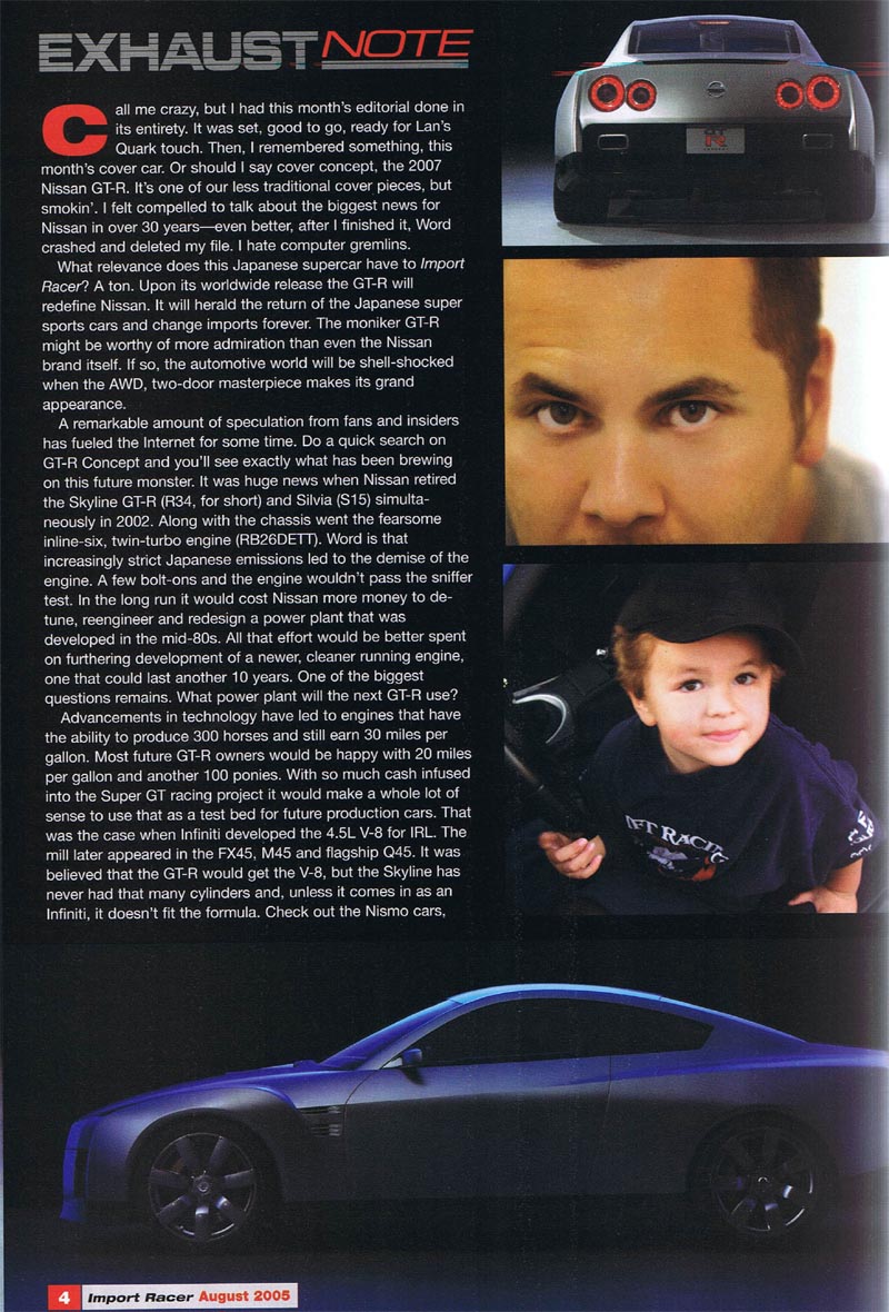 Call me crazy, but I had this month’s editorial done in its entirety. It was set, good to go, ready for Lan’s Quark touch. Then, I remembered something, this month’s cover car. Or should I say cover concept, the 2007 Nissan GT-R. It’s one of our less traditional cover pieces, but smokin’. I felt compelled to talk about the biggest news for Nissan in over 30 years – even better, after I finished it, Word crashed and deleted my file. I hate computer gremlins.