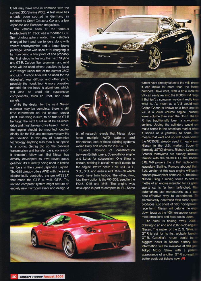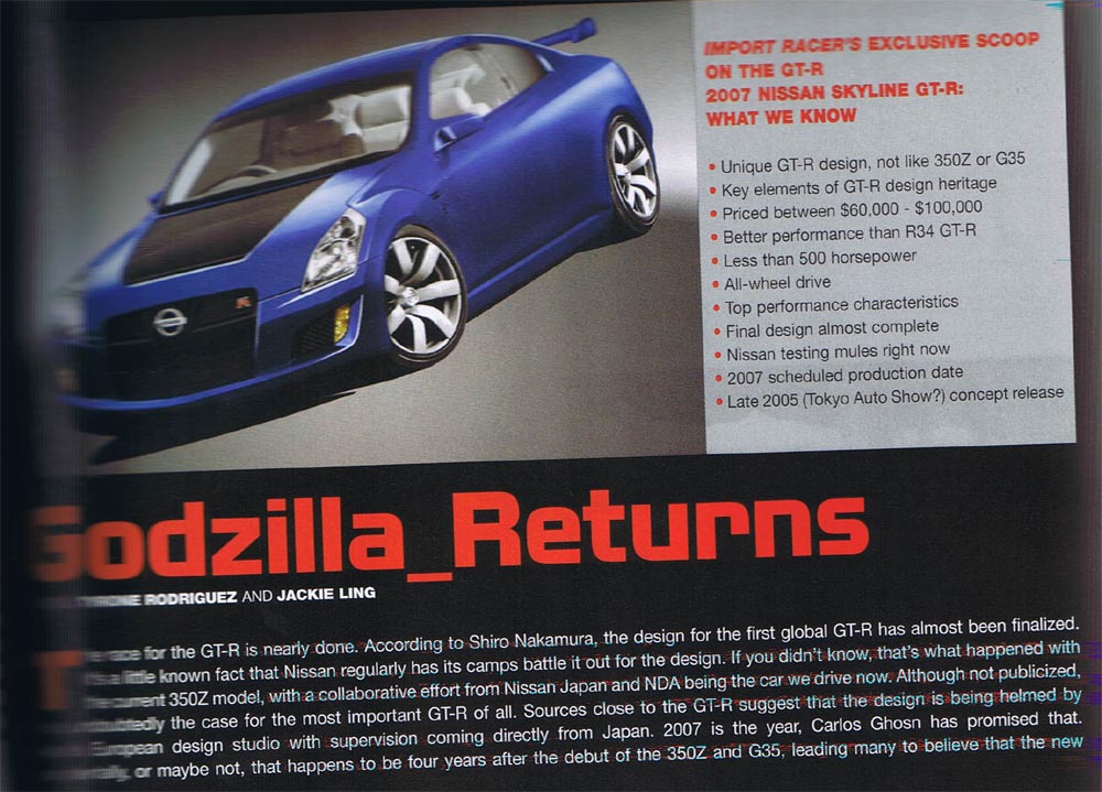 The clock is ticking away. 2005 is drawing to an end and 2007 is closing in on Nissan. The maker of the Z, G, Silvia, and GT-R is set for its first globally launched GT-R. Godzilla’s return could be the biggest news in Nissan history. More information will be available at this year’s Tokyo Motor Show with a potential appearance of another GT-R concept. We better book our tickets now.