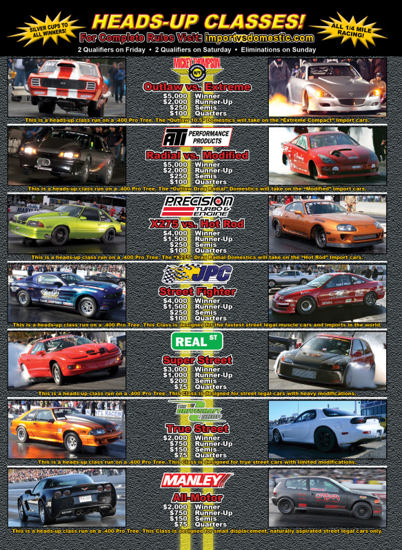 Attachment 1839 Attachment 1840 Attachment 1841 Attachment 1842 The famous 17th Annual Import vs. Domestic battle for the World Championship will take place at Maryland International Raceway on Friday, Saturday & Sunday, November 2-4, 2012. The World Cup Finals features a custom car show, bikini contest, a huge vendor midway, DJs, live bands, and of course import vs. domestic drag racing! With over 20,000 people in attendance every year the WCF has become a event phenomenon on the east coast! Over 600 drag racers compete ever year in eleven different classes to bring you side by side action of every type of genre in drag racing with the top cars from virtually every sanctioning body and series in the country! Forget the trash talking, it's time to prove that these drivers has got what it takes, with each side putting their reputation and egos on the line! In the middle of the pit area is a huge custom car show that attracts over 500 beautiful cruisers, classics, hot rods, tuners, low riders, and exotics every year. The action in the car show on Sunday will be lit up all day by photographers snapping photos of flashy cars and beautiful women. Plus, one of the biggest attractions at the World Cup Finals is the famous bikini contest also held on Sunday with models strutting their stuff on the main stage! Also, be sure to check over 2000' of vendors on the vendor midway. You'll find all kinds of parts, accessories and other items for your Import and Domestic needs at year end prices! Friday & Saturday of the WCF event will be qualifying only, and the vendor midway. The main event will be on Sunday with eliminations, the custom car show, vendor midway, bikini contest, DJs, live music and more! So be sure not to miss the 17th Annual World Cup Finals on November 2-4, 2012 it is going to be epic! 2012 WCF Classes: - Outlaw vs Extreme - Radial vs Modified - X275 vs Hot Rod - Street Fighter - Super Street - True Street - All Motor - 10.00 Index - 10.50 Index - 11.50 Index - 12.50 Index Thursday Schedule - RACER MOVE IN Gates Open ...................................... 10am Racer Parking ............................... 10am-9pm Early Bird Test Session ($100 per car) .... 12noon-6pm Tech Inspection .............................. 6pm-9pm Close Gates ...................................... 9pm Friday Schedule - QUALIFYING Gates Open ....................................... 8am Racer Parking ................................ 8am-8pm Tech Inspection .............................. 8am-8pm Index Qualifying ............................ 10am-8pm Heads-Up Qualifying (#1 & #2)..... 12noon & 4pm Close Gates ...................................... 8pm Saturday Schedule - QUALIFYING Gates Open ....................................... 8am Racer Parking ................................ 8am-8pm Tech Inspection .............................. 8am-8pm Index Qualifying ............................ 10am-8pm Heads-Up Qualifying (#3 & #4)..... 12noon & 4pm Close Gates ...................................... 8pm Sunday Schedule - MAIN EVENT Gates Open ....................................... 8am Car Show Parking & Registration ........... 8am-12noon Car Show Judging ............................ 10am-3pm Index Eliminations ............................... 9am Heads-Up Eliminations ........................... 11am Live Peformance by "Absinthe".................2pm Bikini Contest ................................... 4pm Car Show Awards .................................. 5pm ADMISSION Adult (1-Day Pass)........ $20 Adult (2-Day Pass)........ $35 Adult (3-Day Pass)........ $50 Kids 6-11 (Per Day)........ $5 PARKING General Spectator Parking..............Free Pit Side Spectator Parking..............$10 "Camper Village" Weekend Parking........$25 DRAG RACING Index Classes Entry Fee (Includes All 3 Days).........$75 Entry Fee Head-Up Classes Entry Fee (Includes All 3 Days)......$100 Entry Fee CAR SHOW Sunday Car Show (Includes Driver Admission)..........$30 Entry Fee 2012 WCF Classes: http://www.importvsdomestic.com/rulebook/index.htm 2012 WCF Payouts: http://www.importvsdomestic.com/entr...outs/index.htm 2012 WCF Car Show Info: http://importvsdomestic.com/wcf/show.htm 2012 WCF Vendor Info: http://importvsdomestic.com/wcf/vendor.htm 2012 WCF Bikini Contest Info: http://importvsdomestic.com/wcf/contest.htm Track Info: http://www.importvsdomestic.com/wcf/information.htm Directions: http://importvsdomestic.com/wcf/directions.htm Hotels: http://importvsdomestic.com/wcf/hotels.htm FAQ: http://importvsdomestic.com/wcf/questions.htm WCF Website: http://importvsdomestic.com Track Office: 301-884-9833 Email Questions To: jmiller@mirdrag.com |