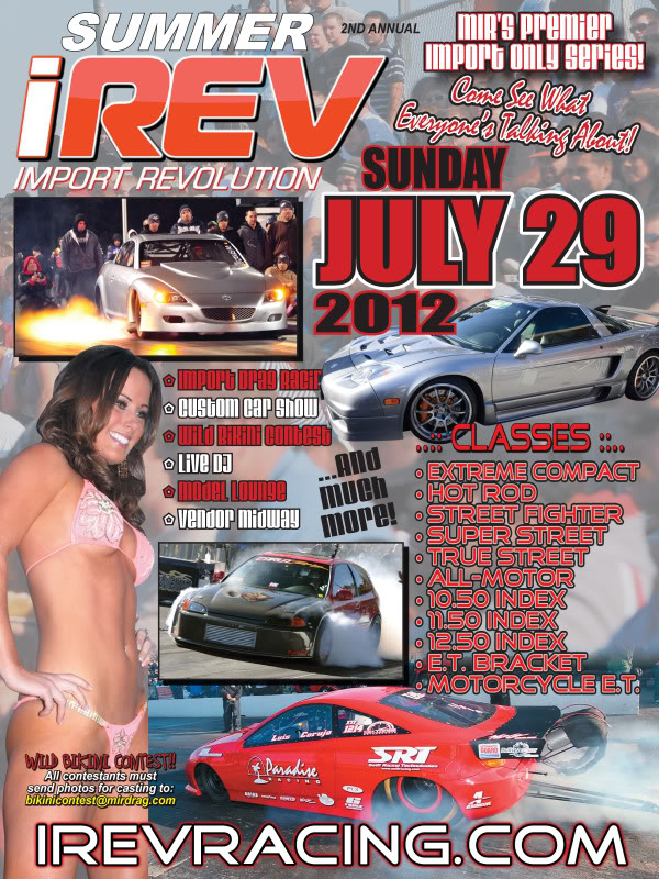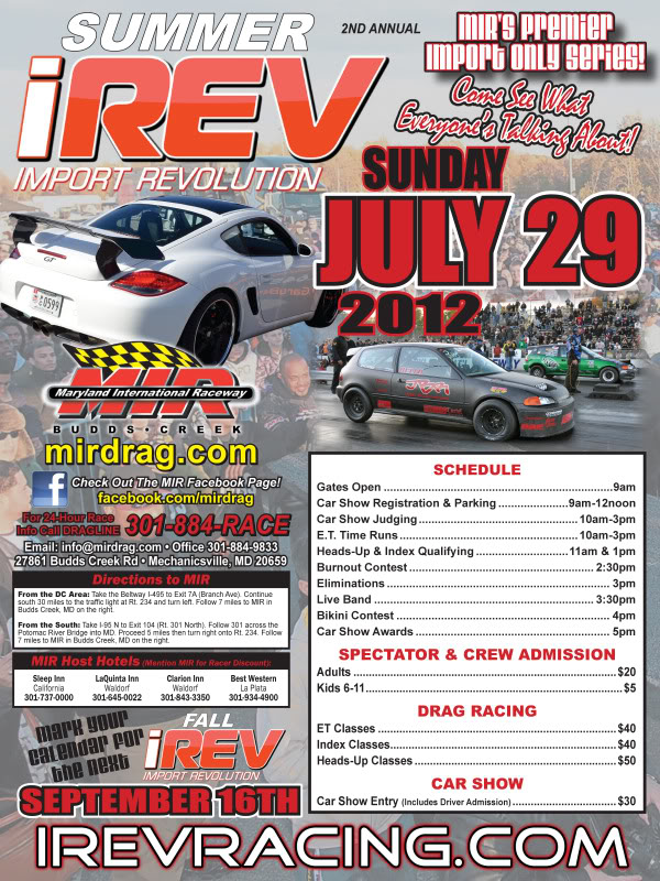 Attachment 1849 Import Revolution (IREV) events are held at Maryland International Raceway and feature: All Import Drag Racing, a Custom Car Show, Bikini Contest, Burnout Contest, Vendor Midway, Live Music, Beautiful Women, and Great Food! IREV will host two events for the 2012 season on Sunday, July 29, 2012 and on Sunday, September 16, 2012. Racers from all over the country will compete for $16,000 in cash purse per event! Eleven different classes will be featured at the event including Heads-Up classes, Index Classes, and Bracket Classes. Maryland International Raceway is one of the best prepped racing surfaces in the country, and records will fall! The IREV event also features a huge Custom Car Show drawing tuners and exotics from all over the DMV area with classes for every type of car! Tons of trophies and special awards are given out at every event! In addition to the Drag Racing and Custom Car Show the IREV event features the very popular $1,200 Bikini Contest, Live Bands, a Smokey Burnout Contest, and a Vendor Midway. So don's miss out on the next IREV event at MIR! EVENT SCHEDULE: Gates Open.............................................9 am Car Show Registration & Parking.................9am-12noon Car Show Judging..................................10am-3pm E.T. Time Runs....................................10am-3pm Heads-Up & Index Qualifying.....................11am & 1pm Burnout Contest.....................................2:30pm Eliminations...................................... .....3pm Live Band...........................................3:3 0pm Bikini Contest.........................................4p m Car Show Awards........................................5pm ADMISSION: Adult Pass.............................................$ 20 Kids Pass (6-11)....................................... $5 PARKING: General Spectator Parking.............................Free Pit Side Spectator Parking.............................$10 WEBSITE: http://www.irevracing.com CLASSES & RULES: http://www.irevracing.com/rulebook/ CAR SHOW INFO: http://www.irevracing.com/show.html VENDOR INFO: http://www.irevracing.com/vendor.html BIKINI CONTEST INFO: http://www.irevracing.com/bikini.html TRACK INFO: http://www.irevracing.com/information.html |