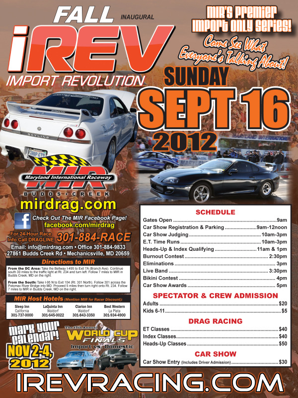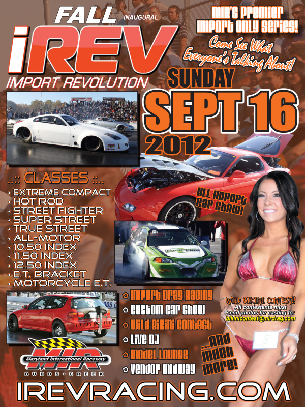 Attachment 1844 The IREV - Fall Import Revolution will be held again at Maryland International Raceway on Sunday, September 16, 2012 and will feature: All Import Drag Racing, a Custom Car Show, Bikini Contest, Burnout Contest, Vendor Midway, Live Music, Beautiful Women, and Great Food! Racers from all over the country will compete for $16,000 in cash purse per event! Eleven different classes will be featured at the event including Heads-Up classes, Index Classes, and Bracket Classes. Maryland International Raceway is one of the best prepped racing surfaces in the country, and records will fall! The IREV event also features a huge Custom Car Show drawing tuners and exotics from all over the DMV area with classes for every type of car! Tons of trophies and special awards are given out at every event! In addition to the Drag Racing and Custom Car Show the IREV event features the very popular $1,200 Bikini Contest, Live Bands, a Smokey Burnout Contest, and a Vendor Midway. So don's miss out on the next IREV event at MIR! EVENT SCHEDULE: Gates Open.............................................9 am Car Show Registration & Parking.................9am-12noon Car Show Judging..................................10am-3pm E.T. Time Runs....................................10am-3pm Heads-Up & Index Qualifying.....................11am & 1pm Burnout Contest.....................................2:30pm Eliminations...................................... .....3pm Live Band...........................................3:3 0pm Bikini Contest.........................................4p m Car Show Awards........................................5pm ADMISSION: Adult Pass.............................................$ 20 Kids Pass (6-11)....................................... $5 PARKING: General Spectator Parking.............................Free Pit Side Spectator Parking.............................$10 WEBSITE: http://www.irevracing.com CLASSES & RULES: http://www.irevracing.com/rulebook/ CAR SHOW INFO: http://www.irevracing.com/show.html VENDOR INFO: http://www.irevracing.com/vendor.html BIKINI CONTEST INFO: http://www.irevracing.com/bikini.html TRACK INFO: http://www.irevracing.com/information.html |