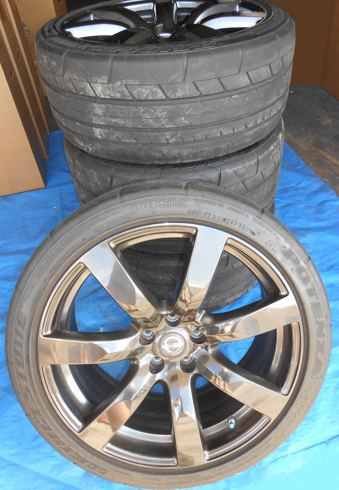 Nissan GT-R take-off wheels and tires (set of 4). Factory mounted/ balanced (tires have never been dismounted from wheels). 1,935 carefully driven miles on wheels/ tires. No wear on tires and no nicks/ scratches on wheels. Front wheels 20x9.5, rears 20x10.5. Tires are factory Bridgestone Potenza RE070's, Fronts 255/40/20 tires and Rears 285/35/20. Selling (4) wheels, (4) tires and comes with (4) center caps and (4) pressure sensor monitors. Factory Balanced and ready for install. Originally asking $3,100 plus shipping. Now $2,850 shipped, shipping included anywhere in U.S. If interested email me at pcconnection27@yahoo.com.