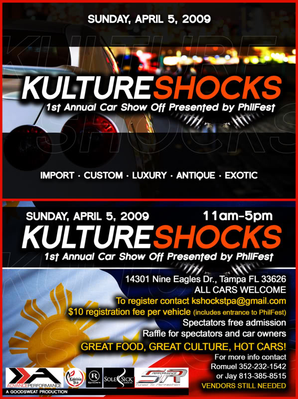 KULTURE SHOCKS 2009!!! **Reminder** -Event starts from 11am-5pm -$10 @ the gate per vehicle, which includes entrance into PhilFest and to the raffle!!! -Drivers, be @ the event early, to set up your ride. ** SPOTS ARE LIMITED** //This is Kulture Shocks 1st "Car Show Off" and not a "Car Show" We will be raffling service and items from our sponsors an vendors, so don't miss out!!!\\ Come and - Show Off your ride - Enjoy the festivities - Eat the food!!! - Listen to DJ Xspek & DJ Kid U Not and other DJ's from around FL. - Get your car detailed. Sponsors and Vendors---> - Advance Performance Tires & Wheels - S & R Performance - Kaleisia Tea Lounge - Renown Streetwear & Lifestyle Boutique - SoleSick Dance Co. - RimLox.com - Ricardo's Moibile Detailing Company - WILD 98.7 http://www.wild987.fm/Events---Places-To-Be/2729699 **What else is there on a Sunday afternoon?** We'll SEE EVERYONE THERE!!!!!!! |