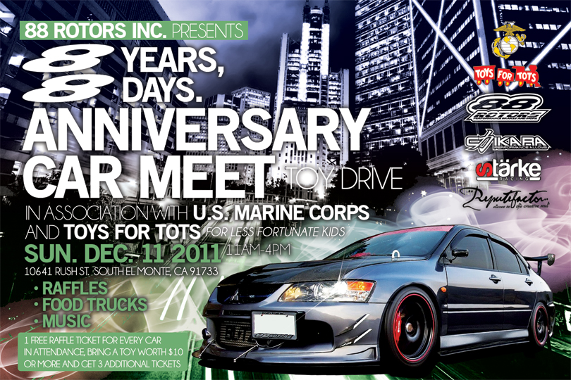 The flyer says it all! This event is to celebrate 88 Rotors Inc's 8 year anniversary and to collect toys for less fortunate children for this holiday season!!