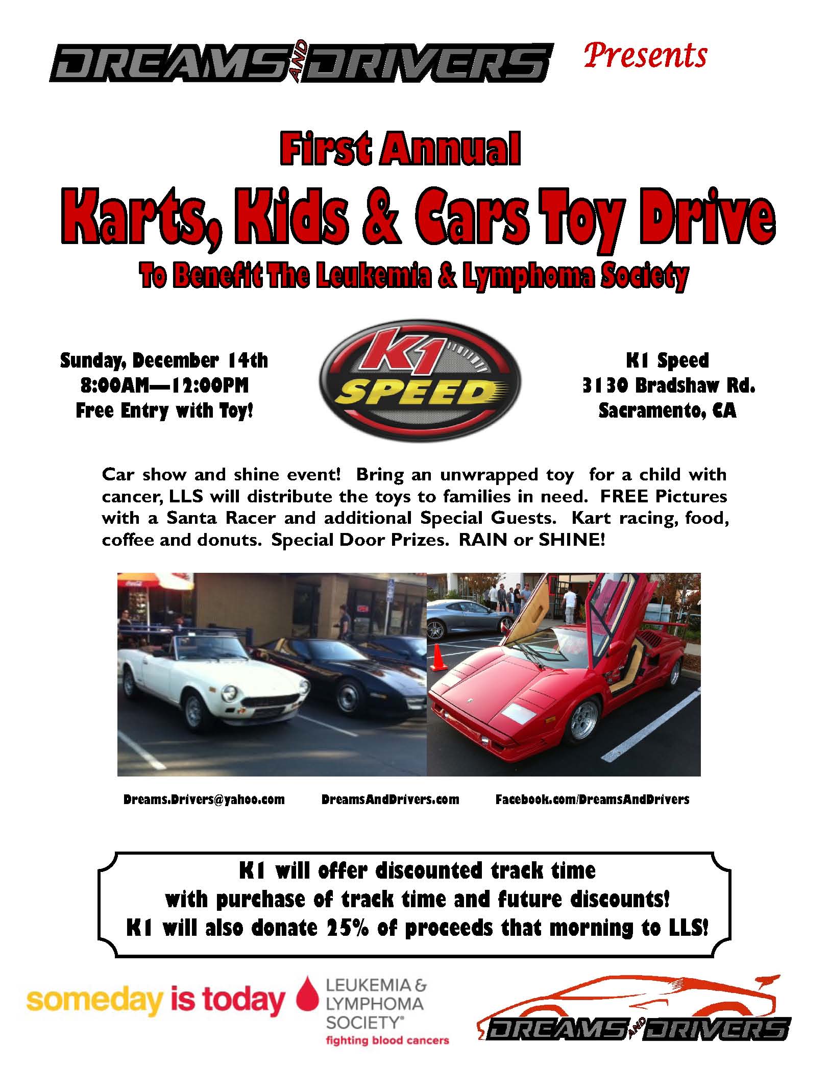 December 14th, Karts, Kids and Cars Toy Drive at K1 Speed...from 8am till Noon. All proceeds and toys benefit Leukemia and Lymphoma Society of Sacramento